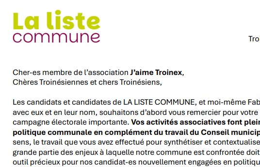 Deux associations troinésiennes nous ont fait parvenir des questionnaires dans le cadre des élections. La Liste Commune a choisi de répondre par une soirée discussion avec les membre qui a eu lieu le 10 mars. Nous avons également répondu par écrit. Vous pouvez consulter nos réponses: